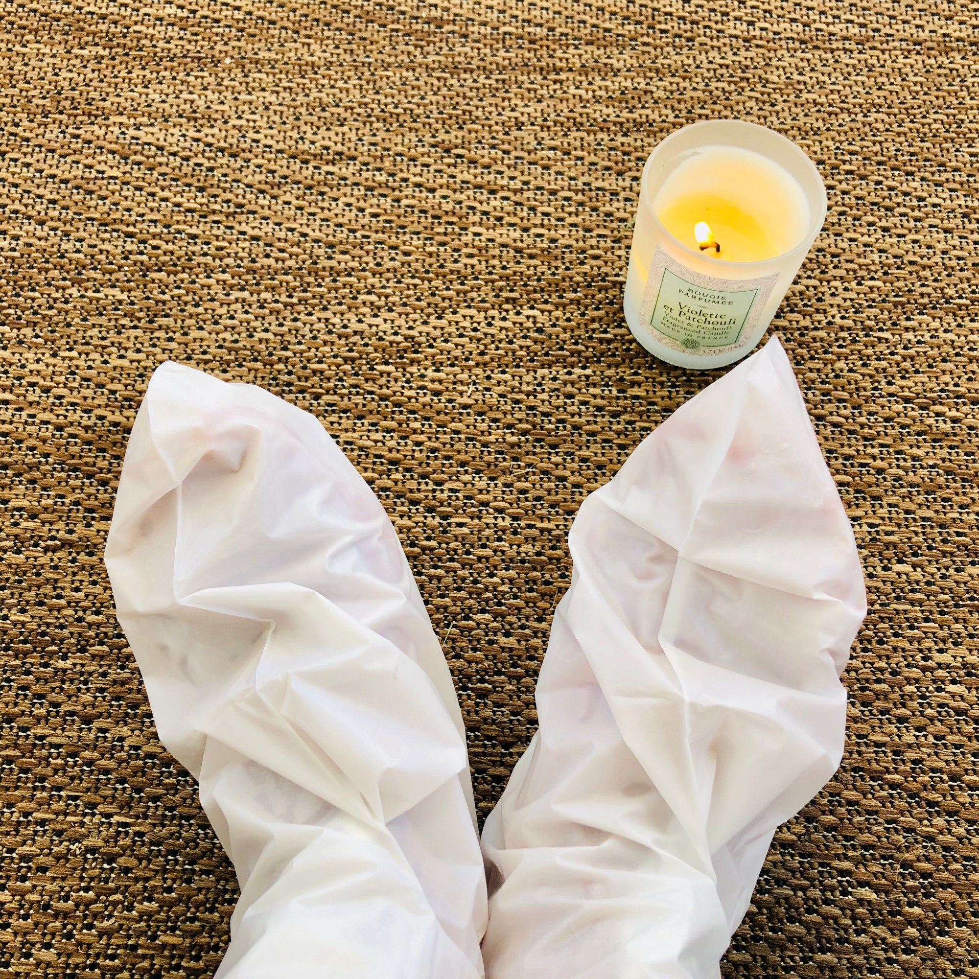 5. Rinse and get ready to moisturize. I grabbed these handy foot mask packets at my local CVS on my last essentials run. Who knew these even existed? They’re even big enough to fit my husband’s feet. Still, I wouldn’t recommend a store run just for these. You can make an easy at home version using 2 Ziplock storage bags, rubber bands to secure them around the ankles and make your own luxurious mixture of melted coconut oil, a few drops of essential oil and a heavy moisturizer like Cetaphil. Slather those puppies in goodness, wrap them up and set the timer for 20 minutes… or maybe one more Netflix episode.