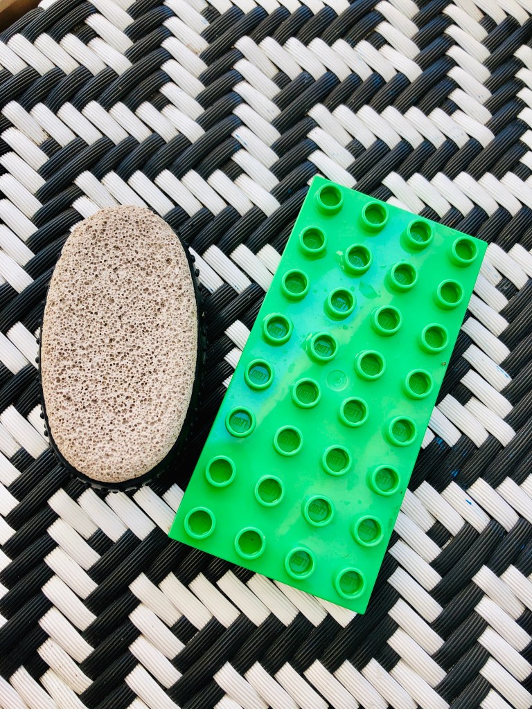 4. Put those muscles to work. Time for that spa scrub. Grab your handy pumice stone and get after those heels like you’re working for a tip. Bonus if you have an exfoliating scrub on hand to add to the relationship but not necessary. No exfoliating scrub? Mix 3 tbsp baking soda with 1 tbsp water for the perfect exfoliating paste. No pumice stone? Chances are, if you are living the hardcore mom-life like me, you have a handy Lego base on hand to sub in. No need to tell your kids, we can keep this little secret between us.